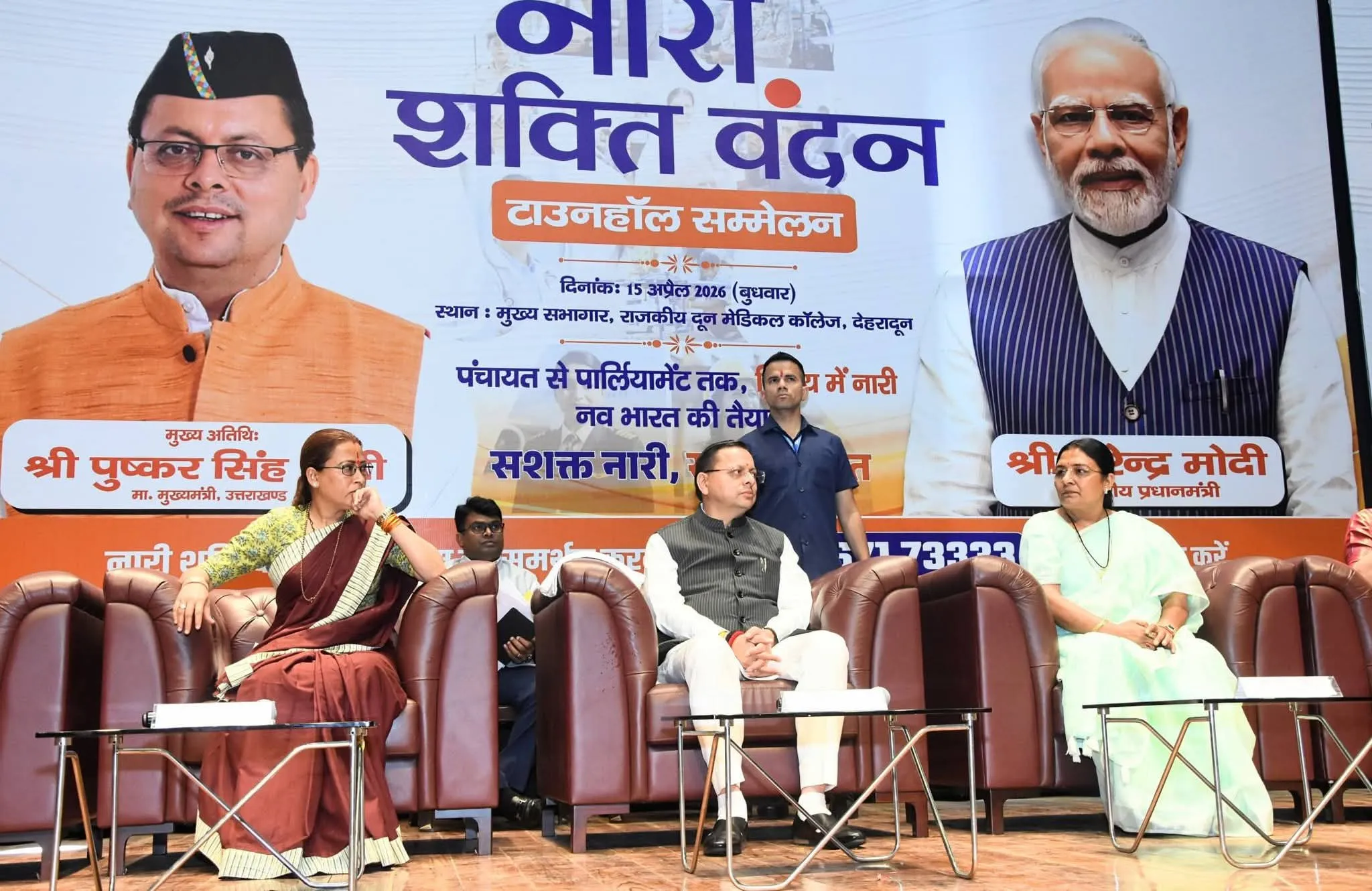 देहरादून, 15 अप्रैल।* राजकीय दून मेडिकल कॉलेज में नारी शक्ति वंदन टाउन हॉल सम्मेलन का आयोजन किया गया। इस अवसर पर मुख्यमंत्री पुष्कर सिंह धामी ने प्रधानमंत्री के दूरदर्शी नेतृत्व की सराहना करते हुए नारी शक्ति वंदन अधिनियम को देश की मातृशक्ति के सशक्तिकरण की दिशा में एक ऐतिहासिक कदम बताया।